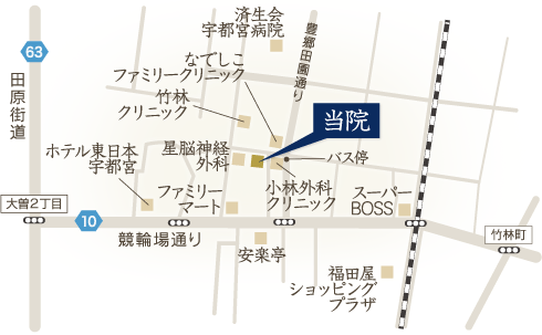 当院は、「済生会宇都宮病院」と「競輪場通り」の間に位置します。